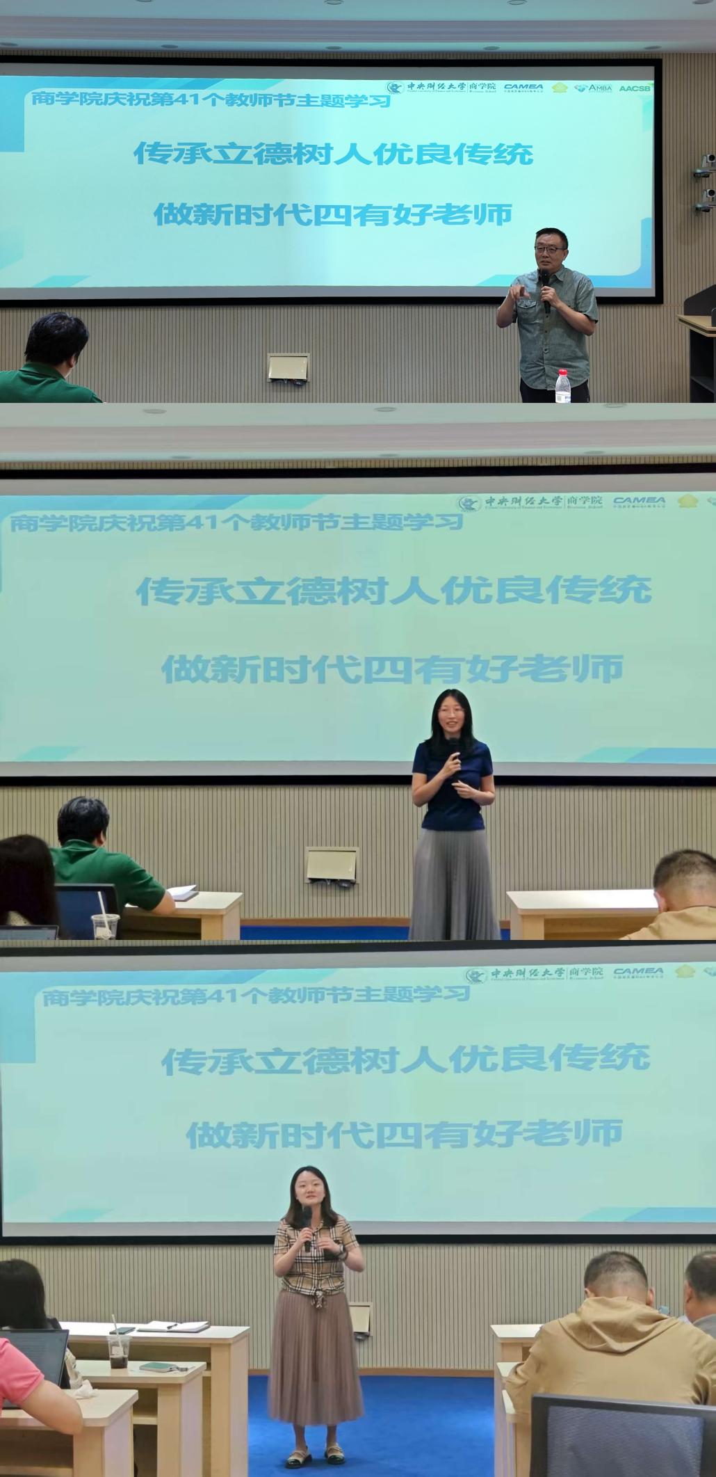 2025年9月10日下午,必赢76net线路在MBA教育中心A28举行了以“传承立德树人优良传统,做新时代四有好老师”为主题的教师节学习活动。本次活动旨在通过学习必赢76net线路首届“龙马奖章”获得者王巾英教授优秀事迹,激励广大教职工不忘初心,牢记使命,努力成为新时代的“四有”好老师。学院全体教职工参加学习,活动由必赢76net线路副院长顾雷雷主持。