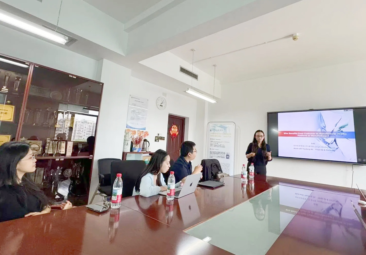 Prof. Yang Liu's lecture focused on "Who Benefits from Customer to Manufacturer (C2M): Platform or Manufacturer?".Customer-to-Manufacturer (C2M) models are becoming increasingly popular on e-commerce platforms. These platforms purchase private-label products (P-products) from manufacturers and sell them to customers. At the same time, manufacturers directly sell their branded products (N-products) to customers on the platform. The study focuses on C2M involving one manufacturer and one platform. The findings indicate that under the exogenous wholesale price of P- products, an increase in wholesale price benefits the manufacturer without harming the platform, promoting cooperation between both parties. When the wholesale price is endogenously determined by the manufacturer, C2M creates a win-win situation where both the manufacturer and the platform gain higher profits, and social welfare increases. Specifically, the platform always benefits from establishing P-products. When the quality of P-products is sufficiently high, the manufacturer earns higher profits in C2M than in a single-product market.