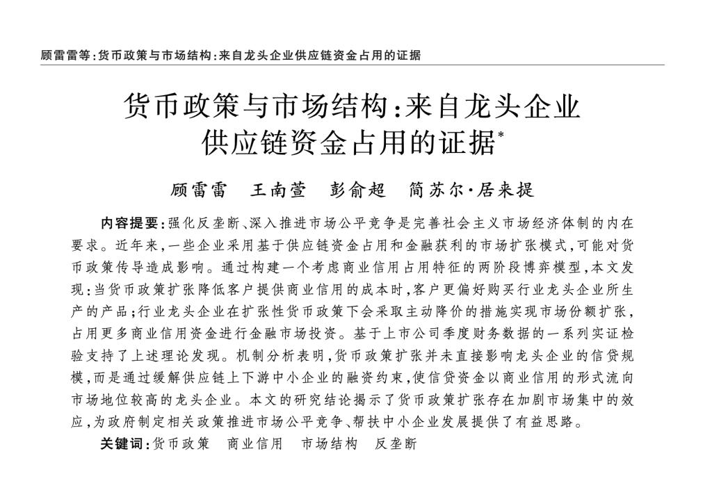 近日,必赢76net线路顾雷雷教授与金融学院彭俞超教授、博士生王南萱、简苏尔·居来提合作的论文《货币政策与市场结构: 来自龙头企业供应链资金占用的证据》在《经济研究》2025年第5期正式发表。该论文是2022年发表于《管理世界》的《数字经济时代的流量思维——基于供应链资金占用和金融获利的视角》一文的延伸性研究成果。